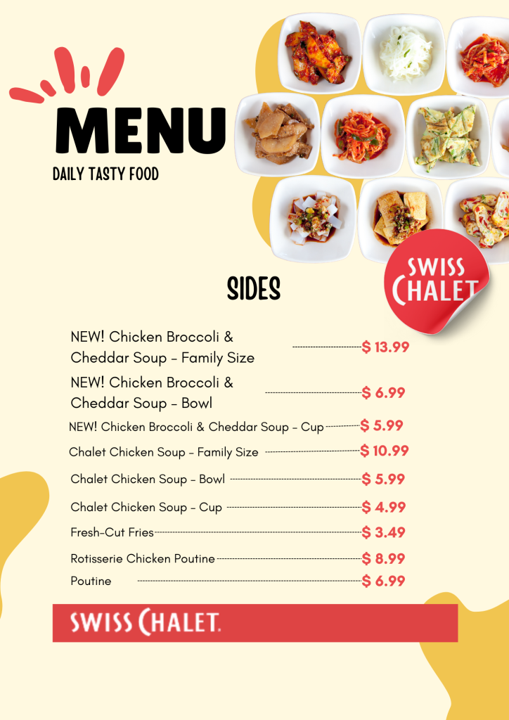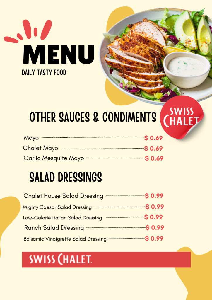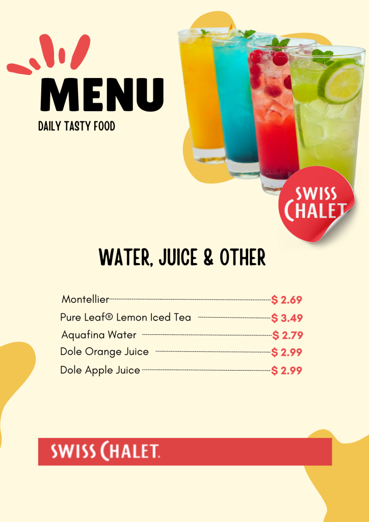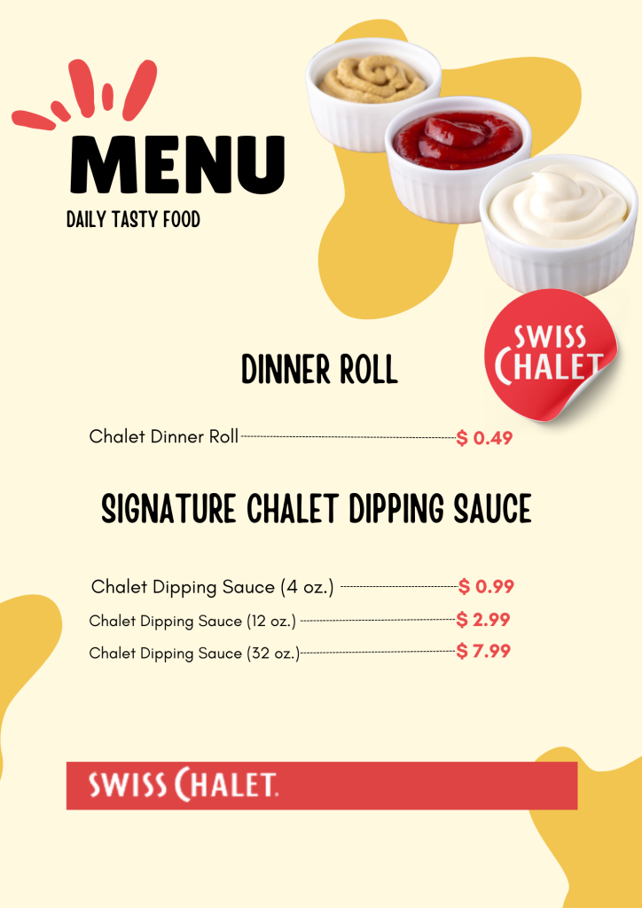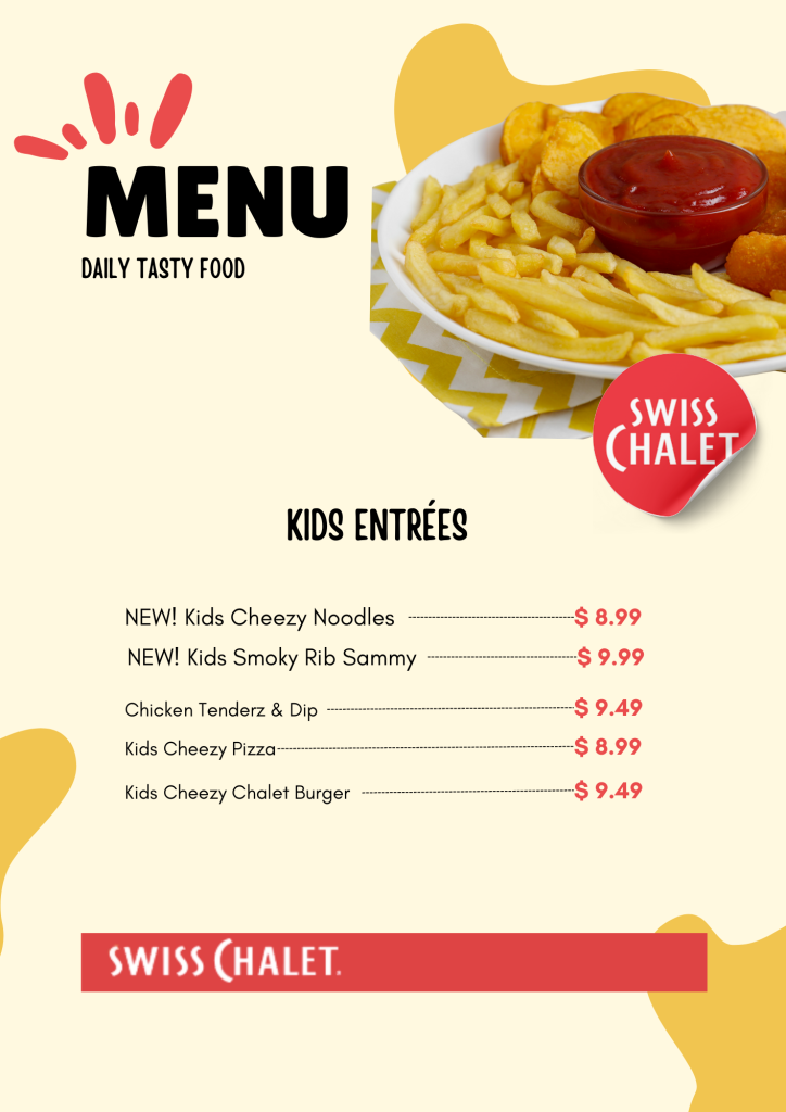 Are you hungry and looking for the Swiss Chalet Menu and prices before visiting the Swiss Chalet Restaurant? Sometimes, it isn’t easy to find them online. Well, we’re solving that problem, making it a piece of cake to explore all the yummy items in one place. Swiss Chalet offers a diverse menu, including Family Meals, Breakfast, Rotisserie Chicken, Burgers, Chicken Nuggets, Spaghetti, Burger Steak, Super Meals, Chicken Sandwiches, Hotdogs, Kids’ Meals, Fries, Desserts, and Beverages.